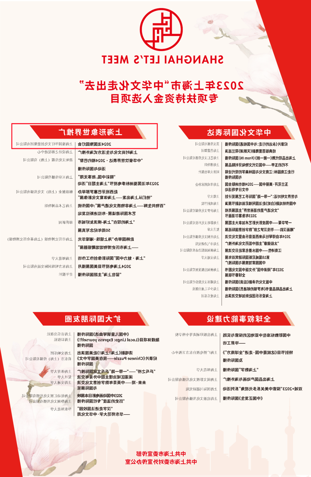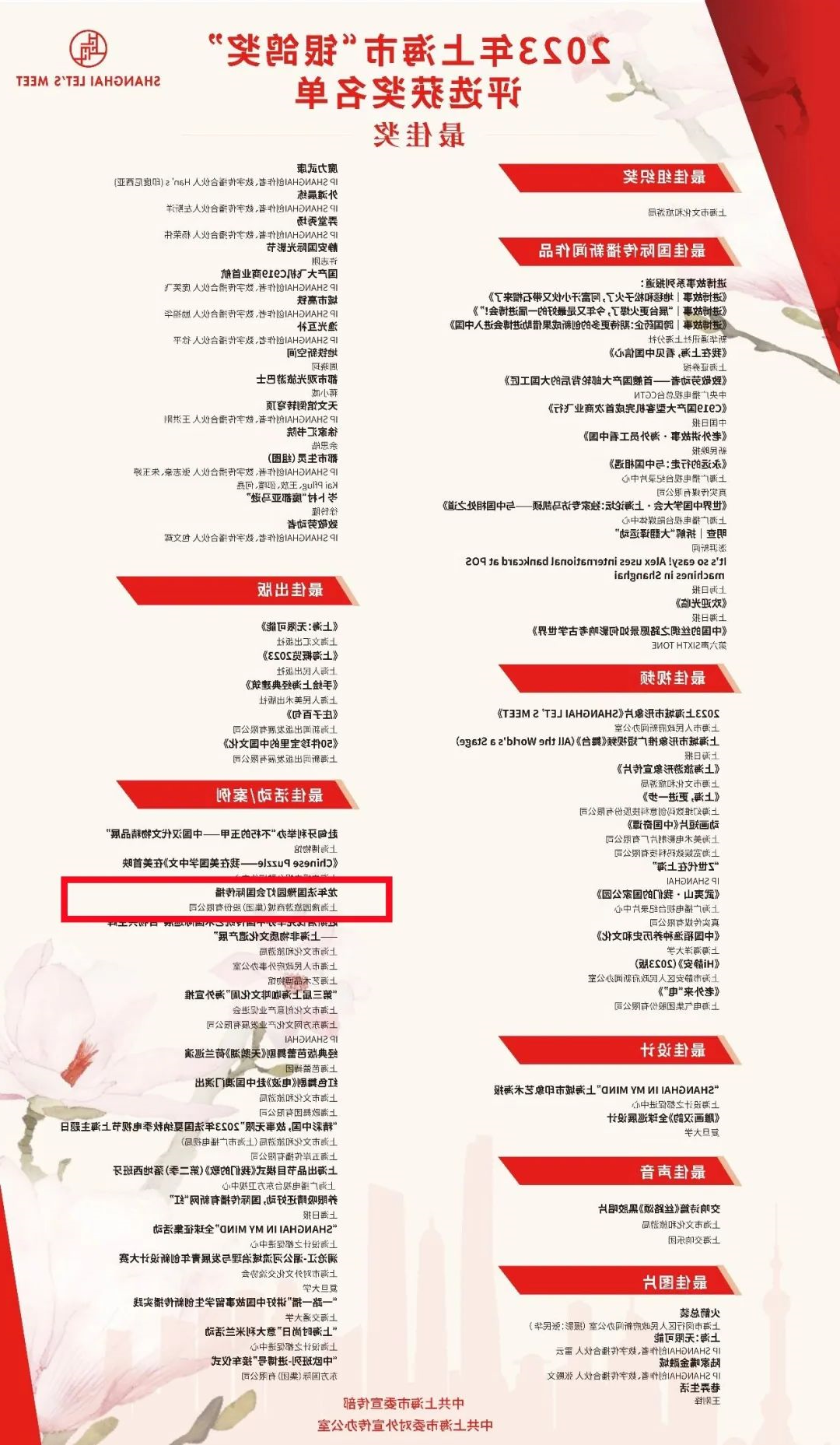 近日,2023年上海市“中华文化走出去”专项扶持资金项目评审和2023年上海市“银鸽奖”评选结果揭晓。经专家评审,2024法国豫园灯会入选2025年深圳市“炎黄传统艺术离开去”专门扶助钱工作;2024法国豫园灯会国际传播获得2023年上海市“银鸽奖”最佳活动/案例。