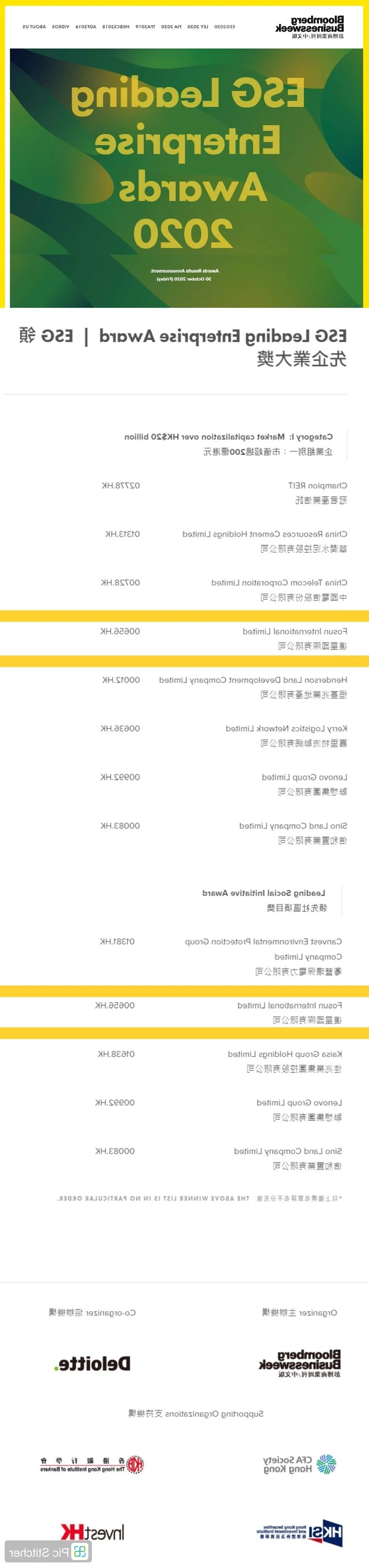 国际上看到《彭博商务专刊英文版版》的通知模板,评为该杂志网站主办方、世界最明显税务注册会计事情所之五的德勤配合举行的“ESG 顶尖制造业企业奖励金-股票总市值200亿港元以上内容”及“ESG 顶尖項目奖”。