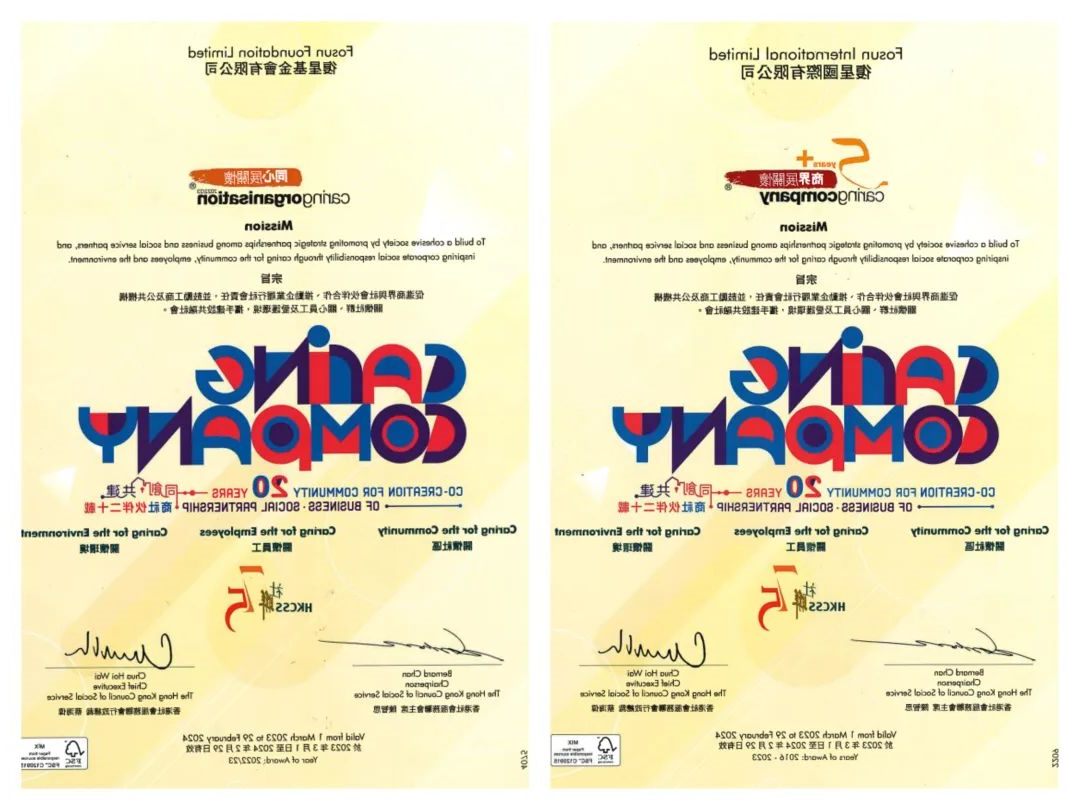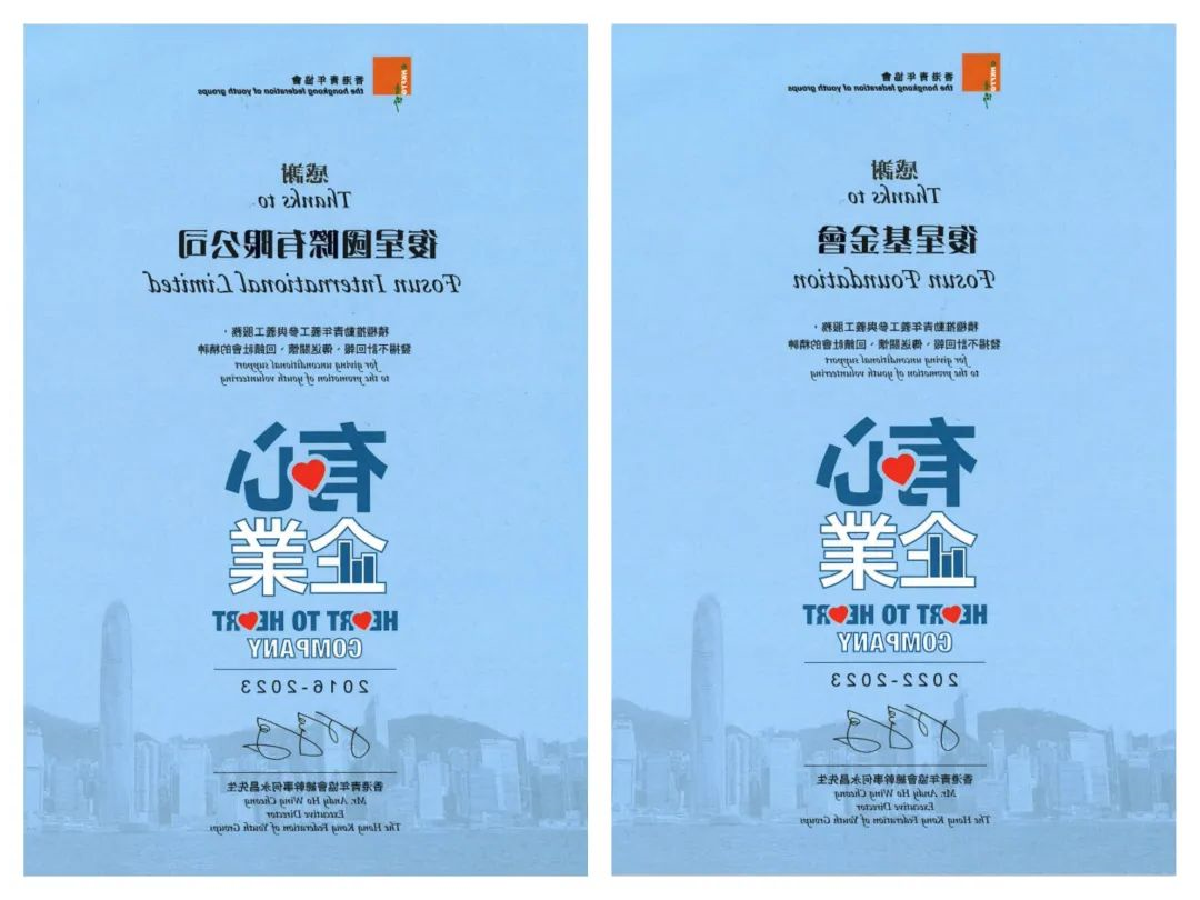 香港青年协会授予HAHA体育 国际有限公司及HAHA体育 基金会“有心企业”标徽及嘉许状,感谢HAHA体育 携手推动香港青年参与义工服务,发扬不计回报、传送关怀、回馈社会的精神。