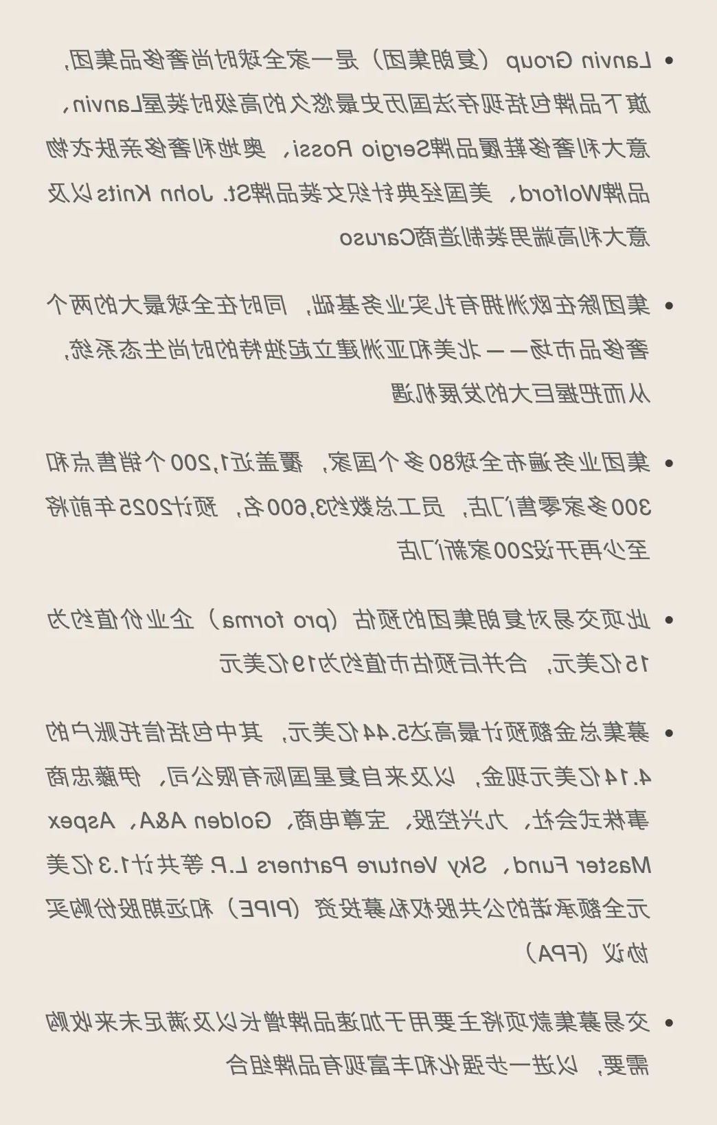 PCAC与复朗司确立半个项行业伴有合同协议。会根据拟议的行业伴有,复朗司将已成为行业伴有后直营司Lanvin Group Holdings Limited(“伴有司”)实业旗下全资子司。我司交易价格对复朗司伴有后的测算(pro forma)各个企业作用约为16亿澳元,伴有后的测算总股本约为19亿澳元。