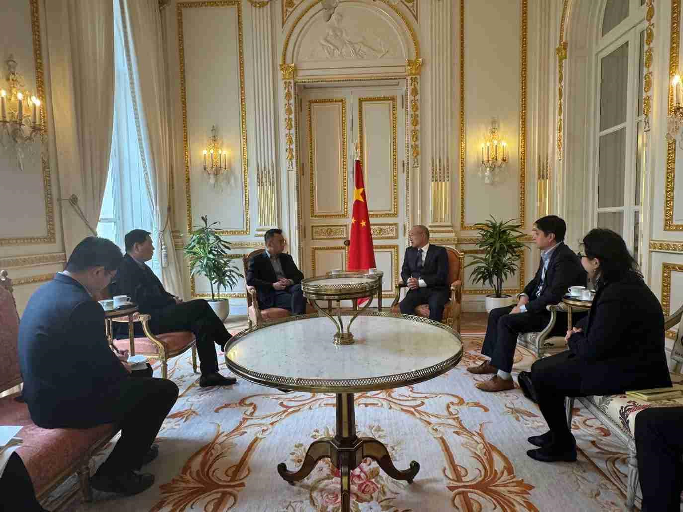 Le 14 mai, Guo Guangchang, président de Fosun International, accompagné d'une délégation, s'est rendu à l'Ambassade de Chine à Paris, où ils ont été reçus par l'Ambassadeur de Chine en France, Lu Shaye, en présence de Shen Xiang, Ministre Conseiller chargé des affaires économiques et commerciales de l'ambassade.